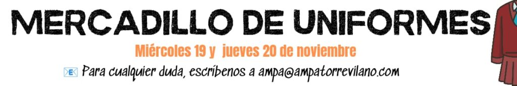 Con la llegada del invierno también regresa una de las iniciativas más útiles y solidarias del AMPA: el Mercadillo de Uniformes. Una oportunidad perfecta para dar una segunda vida a las prendas del uniforme escolar y ayudar a otras familias del colegio. El objetivo es fomentar la reutilización y el consumo responsable, además de contribuir a las actividades que el AMPA promueve durante el curso.